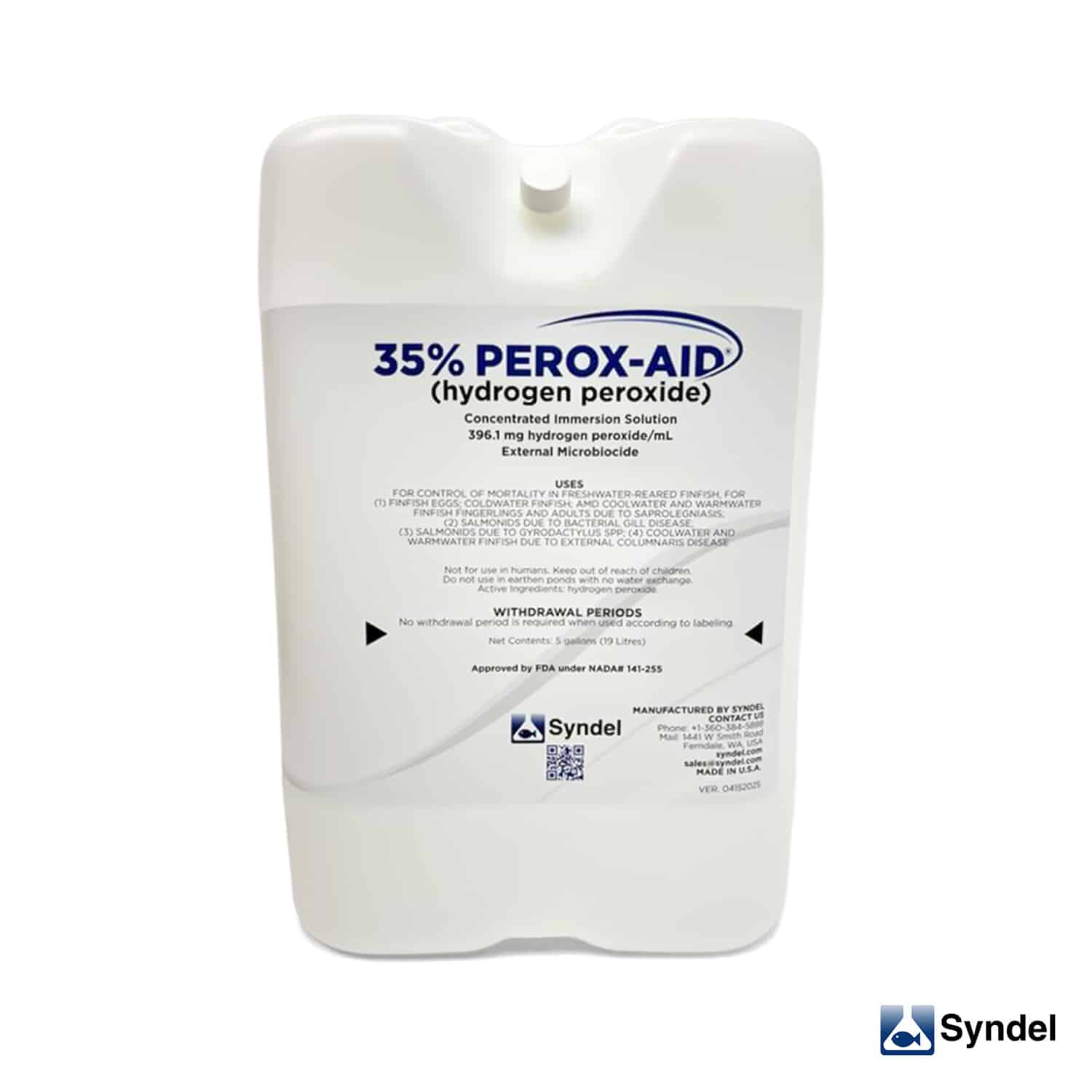 35% PEROX-AID® is a 35% Pharmaceutical grade hydrogen peroxide which is intended for use as an external microbicide for the control of mortality in freshwater-reared finfish eggs due to saprolegniasis, in freshwater-reared salmonids due to bacterial gill disease (associated with Flavobacterium branchiophilum), and in freshwater-reared coolwater finfish and channel catfish due to external columnaris disease (associated with Flavobacterium columnare [Flexibacter columnaris]).